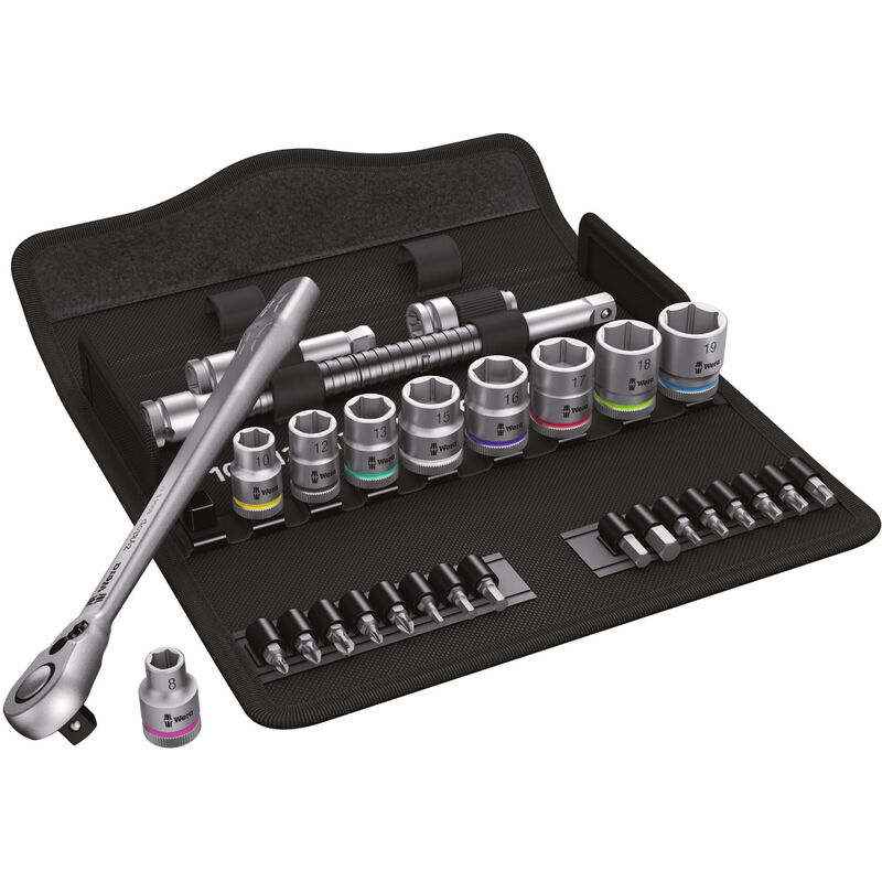 chiavi a bussola secondo DIN 3124. Quadri interni / esterni secondo DIN 3120. Uso: Per viti con esagono esterno / dadi con filettatura M5 − M12 e viti a esagono incassato con filettatura M4 − M10. Per viti Pozidriv e con impronta a croce Phillips con filettatura M2 − M6 e viti con poligono interno Torx® con filettatura M3,5 − M8. Materiale: Acciaio al cromo-molibdeno, cromato opaco. Contenuto: Con cricchetto reversibile n. art. 635295. Fornitura: chiavi a bussola con bocca esagonale: 9 pezzi Dim. 8;