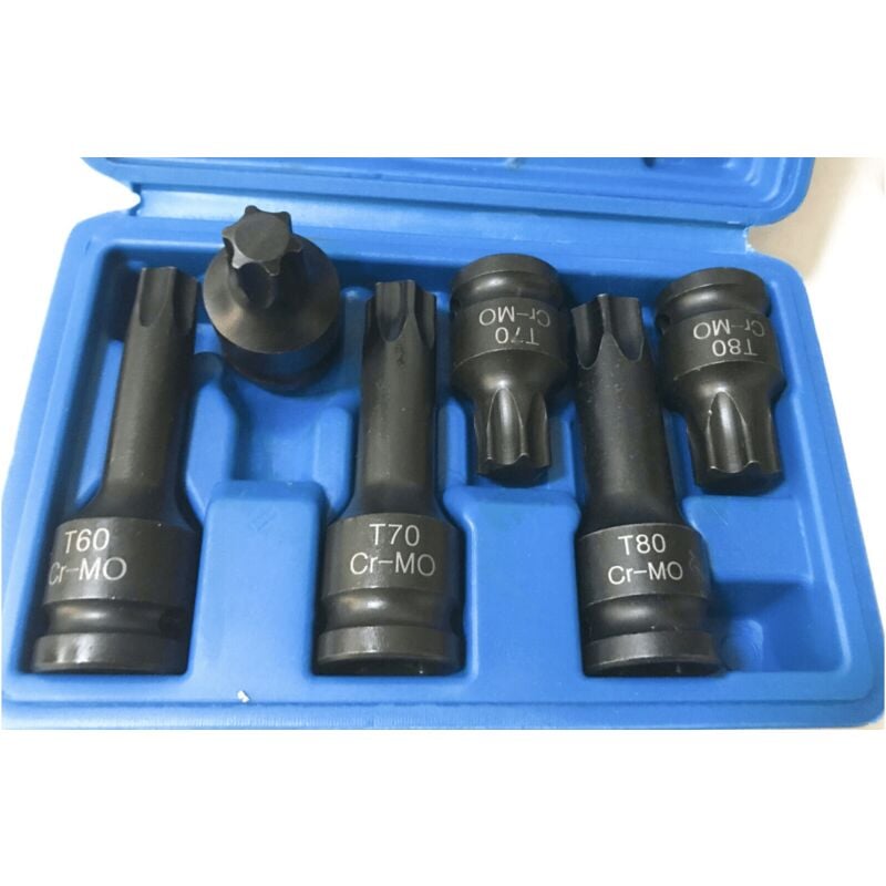 KIT con 6 chiavi a bussola 1/2″ con impronta TORX In acciaio rinforzato cromo molibdeno Uso con avvitatori pneumatici MISURE: T60 - T70 - T80 x 43 mm M60 - M70 - M80 x 78 mm