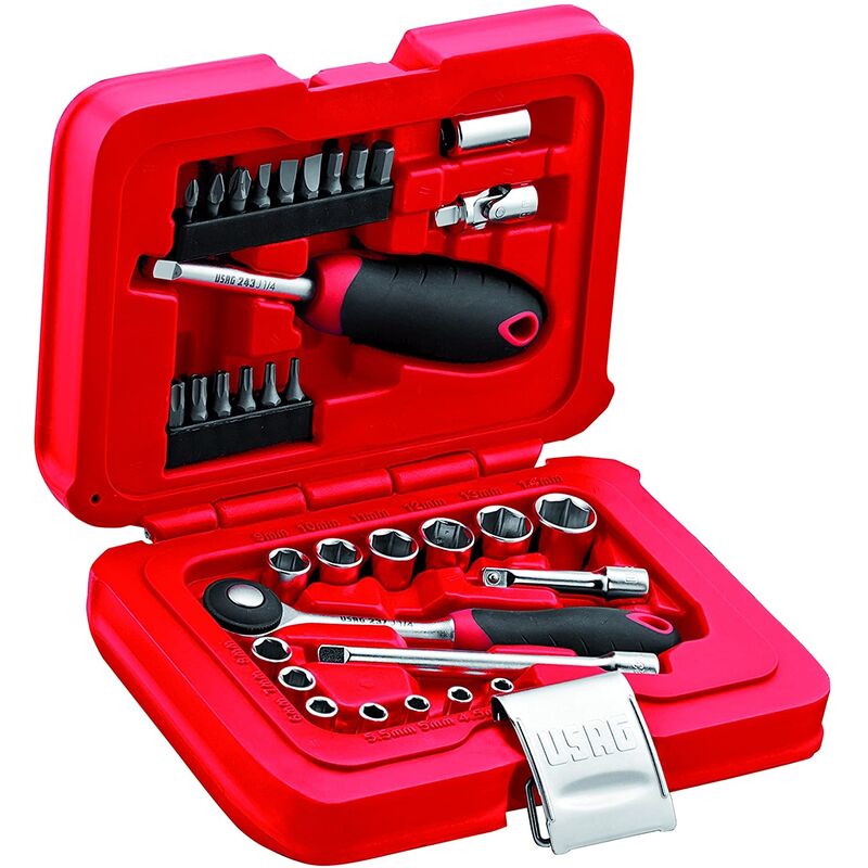 Contenitore compatto in materiale plastico. Clip di aggancio in metallo. Incluso cricchetto reversibile 1/4" con meccanismo a 72 denti e sistema di sgancio della bussola. Contenitore compatto in materiale plastico. Clip di aggancio in metallo. Incluso cricchetto reversibile 1/4" con meccanismo a 72 denti e sistema di sgancio della bussola. CHIUSA la cassetta può essere riposta in un cassetto H60. APERTA la cassetta occupa lo spazio di 1 modulo portautensili. Contenuto: 13 Chiavi a bussola 1/4" con bocca esagonale 4-4,5-5-5,5-6-7-8-9-10-11-12-13-14 mm. 2 Prolunghe 1/4" 55-100 mm. 1 Cricchetto reversibile 1/4". 1 Impugnatura porta-bussole 1/4". 1 Snodo cardanico 1/4". 1 Bussola portainserti 1/4"-1/4". 3 Inserti 1/4" ad intaglio 4-5,5-6. 3 Inserti 1/4" a croce PH 1-2-3. 3 Inserti 1/4" esagonali maschio 4-5-6 mm. 6 Inserti 1/4" TORX T10-T15-T20-T25-T30-T40.