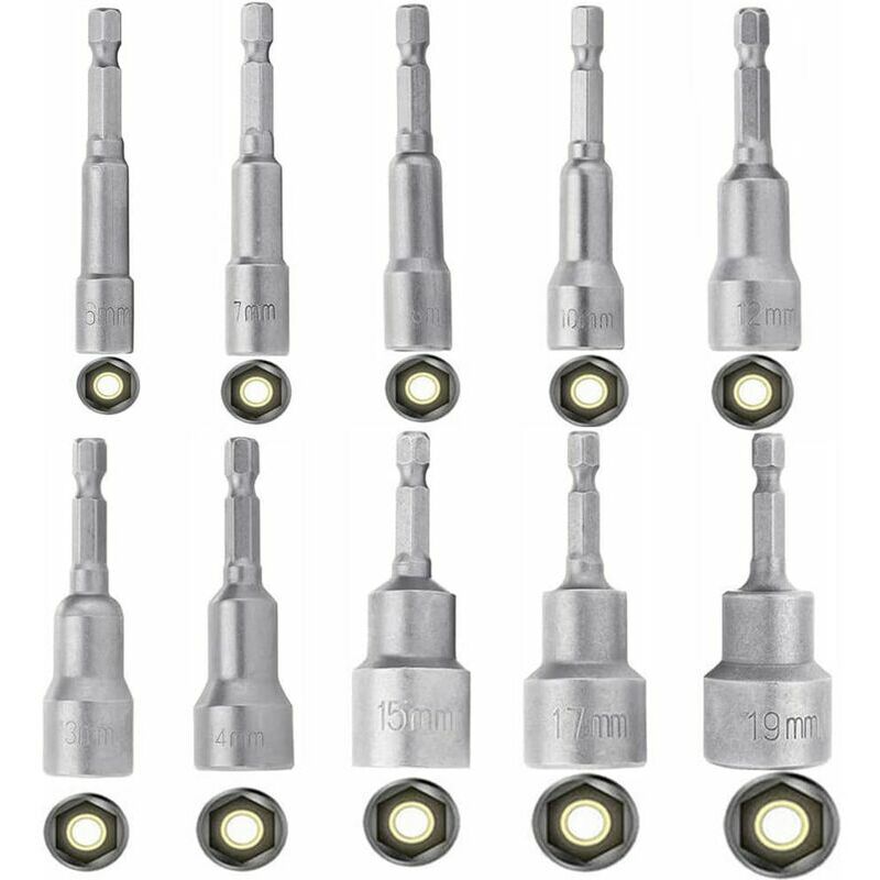 Bussola magnetica esagonale: in acciaio al cromo vanadio (CR-V). Trattamento di tempra ad alta temperatura, durezza superiore, resistenza all'usura, resistenza alla corrosione, forte e durevole, lunga durata. Ogni presa è contrassegnata da un numero di modello per una facile identificazione. Design dell'impugnatura esagonale: l'impugnatura da 1/4 si adatta alla maggior parte dei trapani elettrici con o senza fili. Forte applicabilità, facile da installare e smontare e non facile da staccare durante l'uso. Manicotti magnetici: ogni manicotto ha un magnete all'interno, che può attrarre meglio bulloni o dadi durante l'uso, in modo che possa essere assemblato più rapidamente. Le prese sono adatte per il montaggio e lo smontaggio di bulloni o dadi. Ampia gamma di applicazioni: adatto per il fai-da-te domestico, l'installazione di mobili, la manutenzione dell'auto, i professionisti della riparazione di macchinari, ecc. La presa è adatta per avvitatori pneumatici, avvitatori elettrici