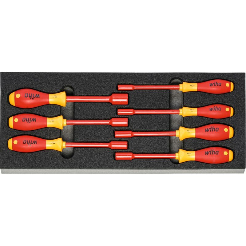 Assortimenti standard di utensili in alloggiamenti in espanso rigido bicolore in PE. La struttura non porosa dell'espanso è impermeabile e resistente agli oli. Strato superiore color antracite, quello inferiore di contrasto color grigio mette in evidenza gli utensili mancanti. Fornitura: Inserto in espanso rigido vuoto n. art. 952001 Dim. 954532: 1 pz. Chiave a bussola WIHA n. art. 622500 Dim. 5,5;