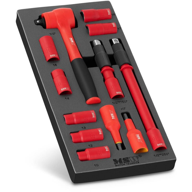 Chiavi a bussola isolate MSW-ITR-10 di MSW Il set di chiavi a bussola con il potente cricchetto permette di montare e smontare in modo facile e veloce diversi dispositivi e oggetti. I singoli pezzi e il manico a cricchetto di questo set di chiavi a bussola sono isolati, rendendolo particolarmente adatto agli elettricisti che devono effettuare lavori di manutenzione o riparazione di apparecchiature elettriche. Questa scatola di attrezzi consiste in un'impugnatura a cricchetto, due estensioni, due inserti da ½ e sette bussole da ½ delle misure 10, 12, 13, 14, 16, 17 e 18 mm. L'ampia gamma di bussole permette di effettuare la maggior parte dei lavori di riparazione o di manutenzione in modo rapido e professionale. La fattura di alta qualità e l'acciaio utilizzato per i singoli componenti permettono di eseguire anche i lavori più esigenti con poco sforzo, grazie al cricchetto che ne facilita l'utilizzo. I singoli elementi delle chiavi a bussola sono isolati dall'elettricità con un