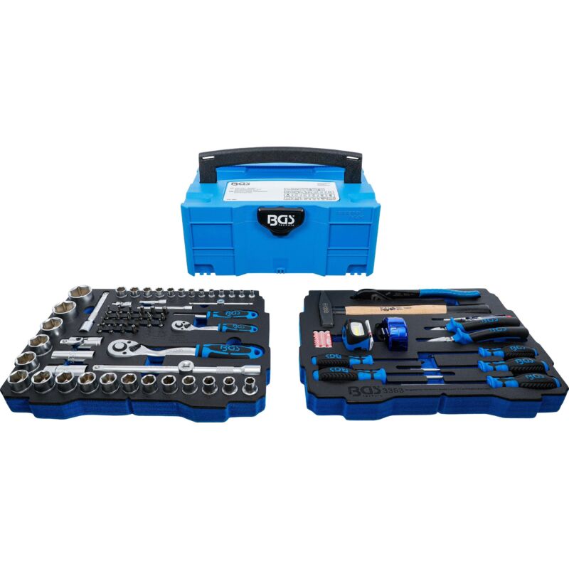Kit di strumenti di base ideale per il meccanico esigente, il tuttofare e il fai-da-te con i suoi 77 pezzi, questo set di strumenti offre un'ampia scelta di utensili ed è adatto a molte applicazioni sistema intelligente di trasporto e stoccaggio utilizzo con una sola mano: chiudere, aprire e collegare con altri systainer in robusta plastica ABS maniglia funzionale e chiusura T-Loc questa valigia fa parte di un sistema multicomponente, impilabile (i contenitori possono essere collegati e trasportati) incl. imbottitura protettiva situata sul coperchio superiore Dimensione interne: larghezza 383 mm | altezza 127,5 mm | profondità 267 mm protetto contro gli spruzzi d'acqua inserti per bussole: prolunghe, cricchetti reversibili, pinze in acciaio al cromo vanadio Finitura superficiale: cromato, opaco cacciavite e inserti in acciaio-cromo-vanadio di alta qualità (S2) Oggetto della fornitura: 1 cricchetto reversibile | dentatura fine | 6,3 mm (1/4) (BGS 618) 1 cricchetto reversibile |