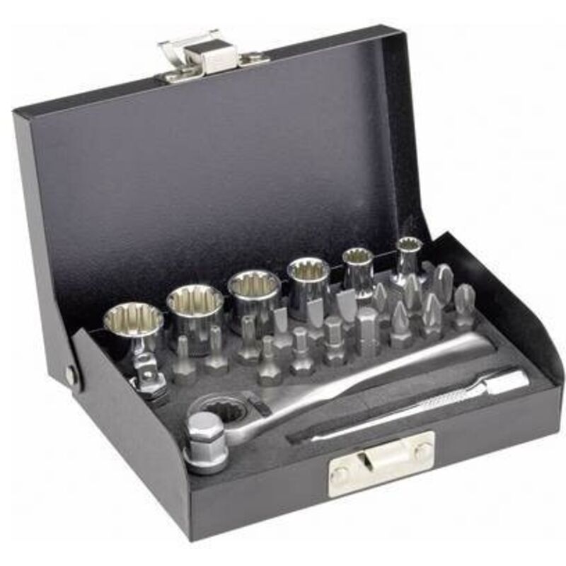 Dettagli tecnici Contenuto 1 KIT Funzione metrico Impronta (cacciavite) 1/4 (6.3 mm) Materiale Acciaio al cromo vanadio, Acciaio S2, Acciaio inox Proprietà del materiale lucido Tipo prodotto Kit di chiavi a bussola Mini set cricchetti da 6,3 mm (1/4) 26 pz. Produzione in acciaio al cromo vanadio altolegato che garantisce la migliore qualità per l'officina. La trasmissione di potenza delle brugole viene trasmessa alla testa della vite non dagli angoli ma dai fianchi. Viene così garantita una maggiore trasmissione della potenza, mentre gli spigoli sensibili del dado restano inalterati. Cricchetto con pulsante di sbloccaggio testa. Punti di forza e dettagli Con cricchetto in acciaio inox Incluso nella consegna 6 inserti per chiave dinamometrica: 5/6/8/10/12/13 mm 16 Bit da 25 mm: PH 1/2/3, a taglio da 4/5/6 mm, PZ 1/2/3, profilo a T con perforazione TO 10/15/20, esagonale da 3/4/5/6 mm Mini cricchetto in acciaio inox da 6,3 mm (1/4) con 72 denti Connessione per inserti da 6,3 mm (1/4)