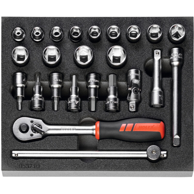 Assortimenti di utensili in alloggiamenti sagomati in espanso rigido bicolore in PE. La struttura non porosa dell'espanso è resistente all'olio e impermeabile. Strato superiore color antracite, quello inferiore di contrasto grigio mette subito in evidenza gli utensili mancanti. Gli alloggiamenti in espanso rigido riempiono 1/4 (10 G × 8 G o 250 × 200 mm) o 1/2 (20 G × 8 G o 500 × 200 mm) della superficie utile dei cassetti. Per: Nuovi carrelli portautensili GARANT per officina con cassetti a estrazione totale e un passo nuovo da 20 G × 16 G o 500 × 400 mm (larghezza × profondità). Gli espansi di dimensione 10 G × 8 G si adattano agli Shadow Board n. art. 923210 Dim. 250 (2 espansi per ciascun Shadow Board). Fornitura: Inserto in espanso rigido vuoto n. art. 952001 Dim. 953710: 1 pz. Bussola esagonale HOLEX n. art. 637220 Dim. 7;