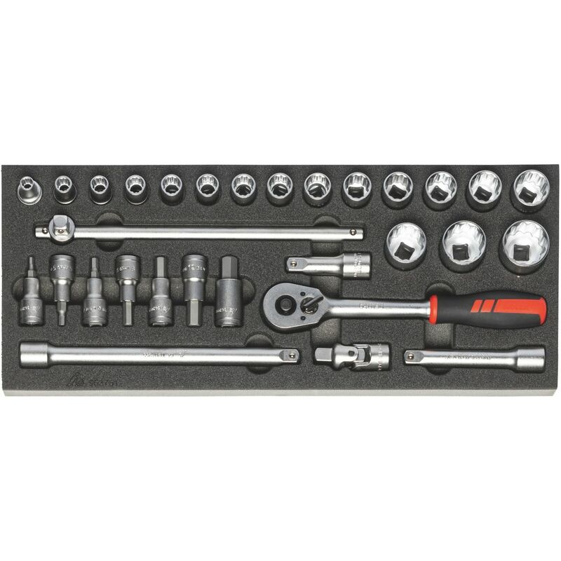Assortimenti di utensili in alloggiamenti sagomati in espanso rigido bicolore in PE. La struttura non porosa dell'espanso è resistente all'olio e impermeabile. Strato superiore color antracite, quello inferiore di contrasto grigio mette subito in evidenza gli utensili mancanti. Gli alloggiamenti in espanso rigido riempiono 1/4 (10 G × 8 G o 250 × 200 mm) o 1/2 (20 G × 8 G o 500 × 200 mm) della superficie utile dei cassetti. Per: Nuovi carrelli portautensili GARANT per officina con cassetti a estrazione totale e un passo nuovo da 20 G × 16 G o 500 × 400 mm (larghezza × profondità). Fornitura: Inserto in espanso rigido vuoto n. art. 952001 Dim. 953751: 1 pz. Bussola poligonale HOLEX n. art. 642120 Dim. 8;