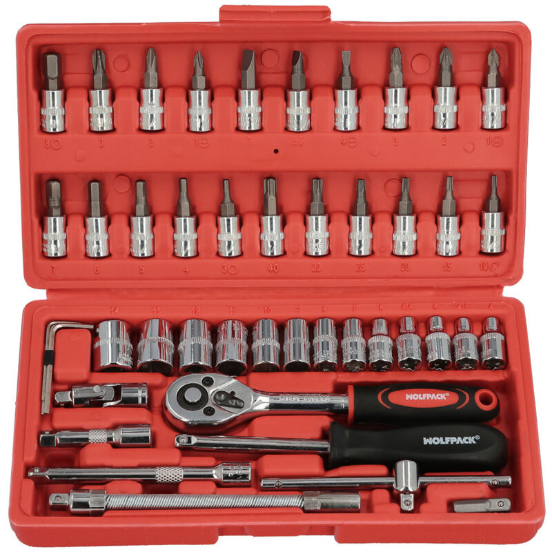 Set chiavi a bussola e inserti 1/4 46 pezzi - Set di chiavi a bussola e cacciaviti realizzati in acciaio al cromo vanadio. - Il set comprende una valigetta in cui è possibile riporre gli inserti e le bussole a seconda della - Il set comprende: > 1 cricchetto da 1/4 > 1 manico per inserti da 1/4 > 1 adattatore per inserti da 5/16 > 2 aste di prolunga (100 e 50 mm) > 1 asta di prolunga flessibile (140 mm.) > 1 maniglia scorrevole. > 1 snodo. > Cartella . > 13 bussole da 4/4,5/5/5,5/6/7/8/9/10/11/12/13 e 14 mm. > 6 punte esagonali 3/4/5/6/7/8 mm. > 6 punte torx misura T10/T15/T20/T25/T30/T40 > 3 punte piatte 4/5,5 e 7 mm. > 3 punte Phillips N. 1/2/3. > 3 punte Pozidriv N. 1/2/3. > 3 chiavi a brugola 1,5/2/2,5 mm. - Ideale per l'uso in meccanica, assemblaggio di mobili, scaffali, bricolage, ecc. - Articolo noto come set di chiavi a bussola, set di cacciaviti, set go bit, set di attrezzi, set di cricchetti, kit di cricchetti, kit di attrezzi, kit di cacciaviti, kit di chiavi a bussola