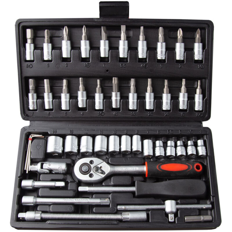 Chiave a bussola a cricchetto STEIN in acciaio al cromo vanadio. Composta da bussole, inserti, adattatori, ecc. Include custodia con nove chiavi a brugola. Chiave a bussola con impugnatura ergonomica per una presa ottimale. Presentata in una pratica custodia in PVC.