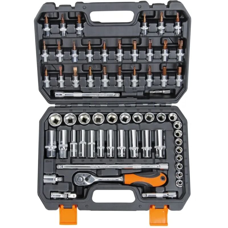 CHIAVI BUSSOLA SUPERLOCK SERIE 62 PEZZI CRV Nr.18 chiavi a bussola da 3/8: 6-7-8-9-10-11-12-13-14-15-17-18-19-20- 21-24mm, Nr.9 chiavi a bussola lunghe da 3/8: 8-10-11-12-13-14-15-17- 19, Cricchetto reversibile attacco da 3/8 con impugnatura in bimateriale, 2 bussole per candele da 16 e 21mm, 3 prolunghe, adattatore 3/8 con foro per leva, snodo cardanico, 26 inserti per viti torx, con intaglio, phillips, pozidriv, esagonali - Adattatore per mandrino - Componenti in acciaio cromo vanadio