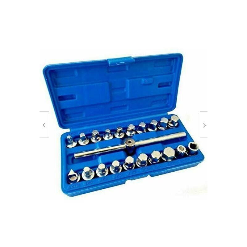 Pratico set composto da 21 robuste bussole Materiale: cromo vanadio Attacco: 3/8 Bussole: XT45, S5/16, S3/8, S7, S8, S9, S10, S11, S12, S13, S14, XT10, H8, H9, H10, H12, H13, H14, H17, H16, XT10