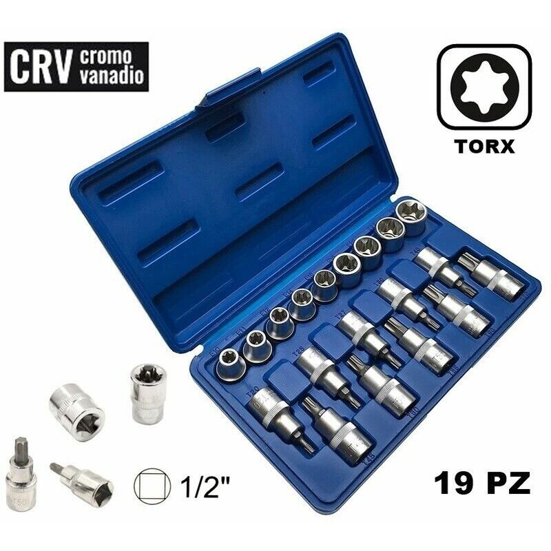 Set di chiavi a bussolatorx maschio e femminada 1/2 - 19 pezzi.set di chiavi a bussola torx maschio e femmina con attacco da 1/2 pollice.il set si compone di 19 di misura:10 chiavi a bussola torx maschiocon attacco da 1/2 di misura:t20 - t25 - t27 - t30 - t40 - t45 t50 - t55 - t60 - t709 chiavi a bussola torx femmina ditipo e con attacco da 1/2 di misura:e10 - e11 - e12 - e14 - e16 - e18e20 - e22 - e24 realizzate in acciaio chrome vanadiumlucidato a specchio.il tutto in pratica valigetta diplastica, leggera e resistente.