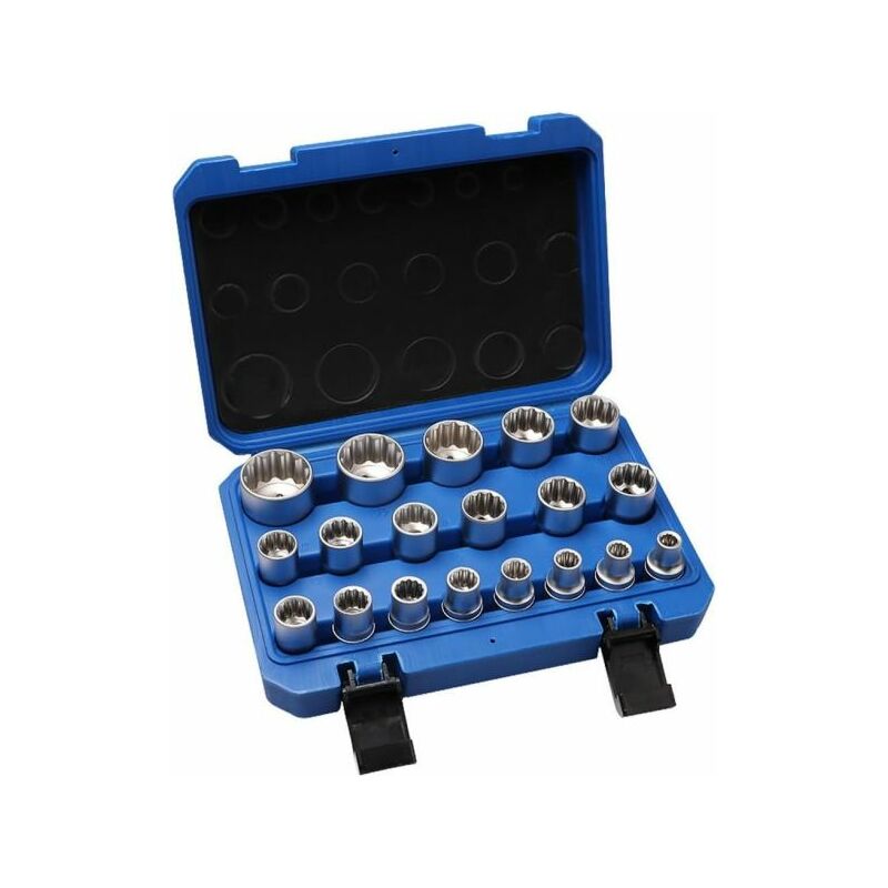 Pratico e comodo set 19 pz millerighe, ognuno con attacco quadro 1/2 (12.5 mm), realizzati in acciaio al cromo vanadio, cromato e con zigrinatura per una presa eccellente utilizzato da speciale profilo Gear block - 12 spigoli per le dimensioni chiave 6 punti, 12 punti, Torx, metriche e in pollici Dimensioni: 8, 9, 10, 11, 12, 13, 14, 15, 16, 17, 18, 19, 20, 21, 22, 24, 27, 30 e 32 mm Adatto anche per Torx E10, E12, E14, E16, E18, E20, E22 e E24 Completamente ordinati in scatola di plastica, strumento per l'esecuzione di altissima qualità!