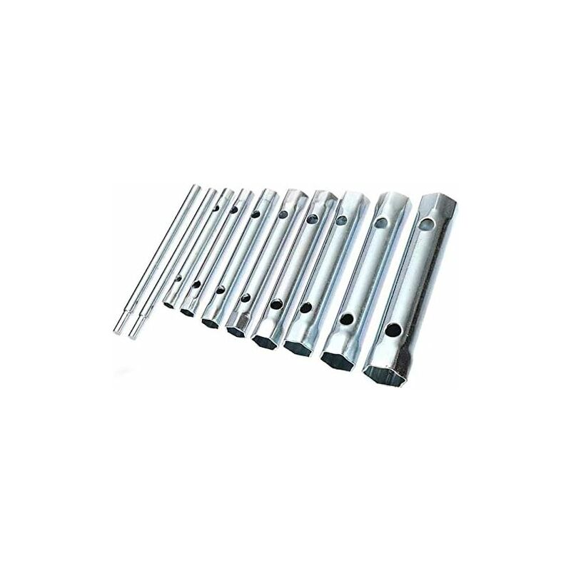 Set di 10 pezzi composto da: 1 chiave a tubo da 6 mm e 7 mm (lunghezza: 91 mm). 1 Chiave a tubo da 8 mm e 9 mm (lunghezza: 92 mm). 1 chiave a tubo da 10 mm e 11 mm (lunghezza: 111 mm). 1 chiave a tubo da 12 mm e 13 mm (lunghezza: 139 mm). 1 chiave a tubo da 14 mm e 15 mm (lunghezza: 104 mm). 1 chiave a tubo da 16 mm e 17 mm (lunghezza: 124 mm). 1 chiave a tubo da 18 mm e 19 mm (lunghezza: 120 mm). 1 chiave a tubo da 20 mm e 23 mm (lunghezza: 129 mm). 1 Chiave a tubo da 21 mm e 22 mm (lunghezza: 132 mm). 2 barre di coppia (lunghezza: 130 e 120 mm). Caratteristiche: - Una serie di strumenti professionali per la riparazione di auto, idraulici, lavori di manutenzione, ecc. - Ideale per l'accesso a dadi e bulloni in luoghi difficili da raggiungere. rivestimento in zinco per resistenza alla ruggine e alla corrosione, resistenza e durata. Design a doppia estremità, finitura lucida. Per uso professionale o domestico. Confezione: 1 set di chiavi tubolari