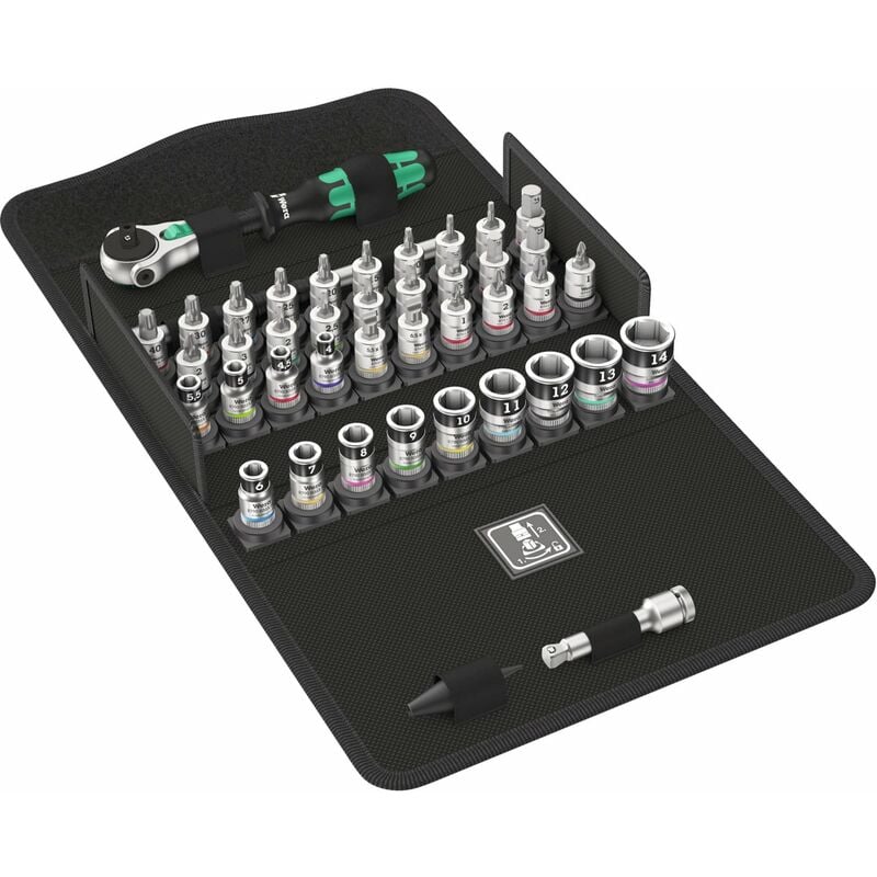 inserti per chiavi a bussola secondo DIN 3124. Quadri interni / esterni secondo DIN 3120. Set dalla forma straordinariamente compatta, adatto a contenere un gran numero di utensili in uno spazio ridotto. Un modo completamente nuovo di concepire il set di cricchetti, grazie alle innovative custodie in tessuto che garantiscono un'elevata robustezza e una maggiore durata. Collocabile in posizione eretta per una conservazione precisa e ordinata degli utensili negli scaffali delle officine. Superficie dotata di materiale esterno in tessuto per una maggiore protezione. Peso e volume ridotti per un trasporto più comodo e agevole. Strumento di ricerca degli utensili “Take it easy” con codifica cromatica delle dimensioni. Set di 42 bussole in robusta custodia in tessuto. Testa orientabile a seconda delle esigenze con 5 fissaggi predefiniti. Chiavi a bussola per viti Torx®, Hex-Plus e a esagono esterno con funzione di fermo per viti e