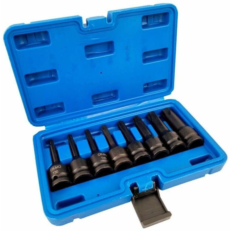 SET KIT CHIAVI BUSSOLE BUSSOLA TORX 1/2 IMPATTO LUNGHE T30 T80 78MM LUNGO 495 Set 8 bussole TORX lunghe, attacco 1/2 MisureT30, T40, T45, T50, T55, T60, T70 e T80