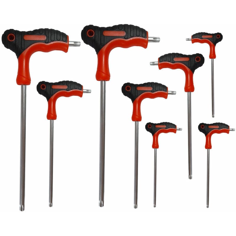 Set composto da 8 chiavi torx senza foro con impugnatura a T. Misure T10 x 100mm T15 x 100mm T20 x 100mm T25 x 150mm T27 x 150mm T30 x 150mm T45 x 200mm T50 x 200mm