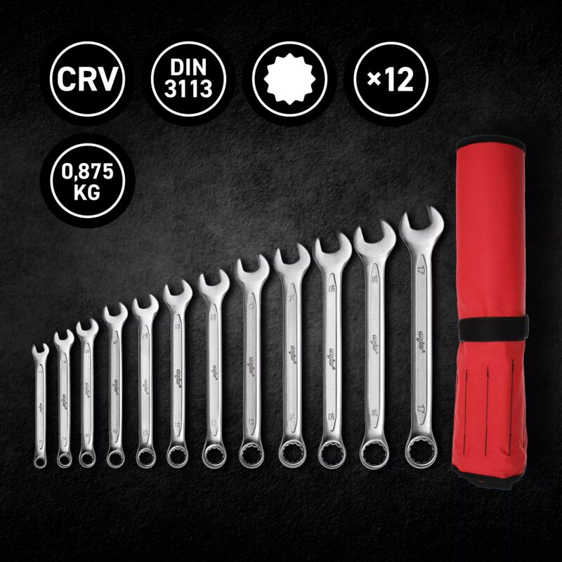 ContenutoChiavi combinate: 6 | 7| 8| 9| 10| 11| 12| 13| 14| 15| 16| 17 Serie di 12 chiavi combinate, ideali per la manutenzione di moto e auto. Contiene le 12 dimensioni delle chiavi più comunemente utilizzate. Sono realizzati in acciaio CrV al cromo-vanadio di alta qualità. Molto resistente, realizzato con precisione secondo la norma DIN 3113 dell'Istituto tedesco di standardizzazione, dimensioni metriche. La testa dell'occhiello è inclinata di 15 gradi, la testa della forcella è inclinata di 15 gradi. L'impugnatura ergonomica e la testa compatta garantiscono la massima funzionalità. Perfetto quando l'accesso alle viti è difficile. Il set verrà utilizzato nei servizi automobilistici (VOLVO, BMW, MERCEDES, AUDI, FORD, FIAT, CITROEN, RENAULT). Robusta copertura avvolgibile con velcro a 360° 300 mm con fori per appendere.