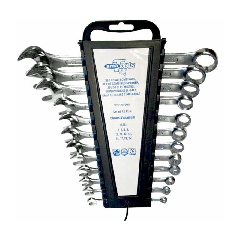 Set di 12 chiavi miste piatte Set di chiavi combinate Hexagon: 6,7,8,9,10,11,12,13,14,17,19,22 Qualità: Cromo vanadio Finiture: lucidato a specchio DIN 3113 - ISO 3318 - DIN 899 Numero di chiavi: 12 Marchio: AMA TOOLS