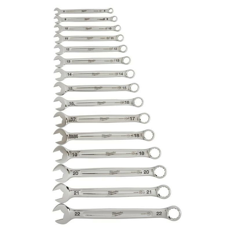 Set di 15 chiavi combinate metriche 8 - 22 mm MAX BITE - Milwaukee 4932464258 - Forcella MAX BITE per limitare l'arrotondamento o il danneggiamento dei bulloni - Comoda impugnatura arrotondata per applicazioni pesanti - Conservazione ottimizzata: set di 15 pezzi in esposizione per una facile conservazione nei cassetti del carrello - Dimensioni incise a inchiostro per un'identificazione rapida e semplice delle chiavi - Scatola disassata per un facile accesso - Acciaio legato cromato Specifiche tecniche Contenuto: diametri 8, 9, 10, 11, 12, 13, 14, 15, 17, 18, 19, 20, 21, 22 mm. Riferimento prodotto: 4932464258 Numero EAN: 4058546222031