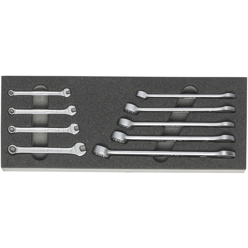 Assortimenti standard di utensili in alloggiamenti in espanso rigido bicolore in PE. La struttura non porosa dell'espanso è impermeabile e resistente agli oli. Strato superiore color antracite, quello inferiore di contrasto color grigio mette in evidenza gli utensili mancanti. Fornitura: Inserto in espanso rigido vuoto n. art. 952001 Dim. 952325: 1 pz. Set di chiavi combinate GARANT n. art. 613610 Dim. 9 (5,5;