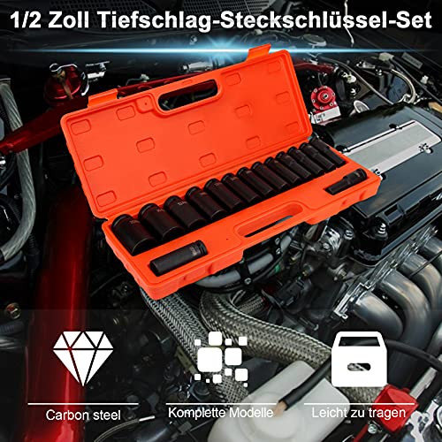 Set di Chiavi a Impulsi 15 Pezzi 1/2 Pollici, 10-32 M in Acciaio al Carbonio Set di Bussole a Impatto Profondo Set di Chiavi a Bussola Esagonali con Coperchio in Plastica per Officina