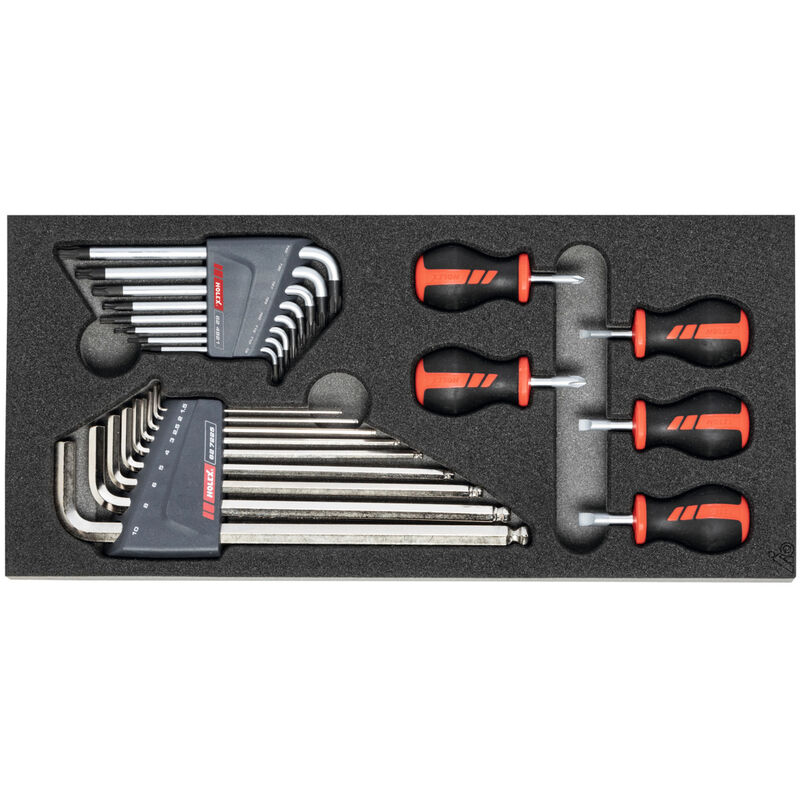 Assortimenti standard di utensili in alloggiamenti in espanso rigido bicolore in PE. La struttura non porosa dell'espanso è impermeabile e resistente agli oli. Strato superiore color antracite, quello inferiore di contrasto color grigio mette in evidenza gli utensili mancanti. Fornitura: Inserto in espanso rigido vuoto n. art. 952001 Dim. 955215: 1 pz. Set di chiavi maschio piegate HOLEX con sfera per viti con impronta Torx® n. art. 624921 Dim. 8 (TX9;