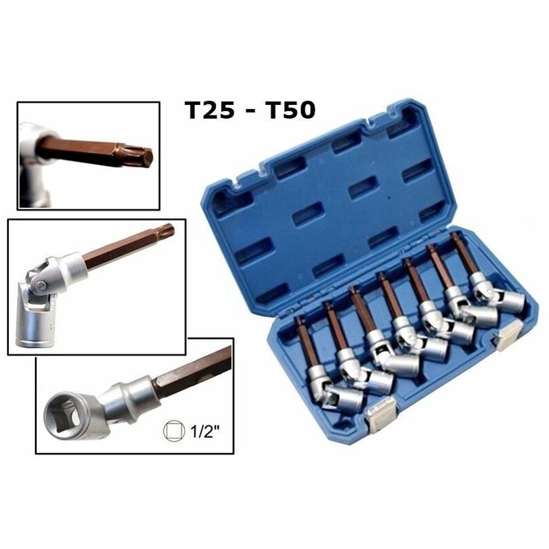 KIT 7 CHIAVI TORX MASCHIOCON ATTACCO A BUSSOLA DA 1/2 SNODABILI. KIT DI 7 CHIAVI TORX MASCHIO DI LUNGHEZZA UTILE DI 65 mm.DOTATE DI ATTACCO A BUSSOLA DA 1/2POLLICE FEMMINA CON INCLUSO SNODO PER AGEVOLARE L'UTILIZZO IN SPAZI ANGUSTI.REALIZZATE IN ACCIAIO CHROME VANADIUM.MISURE ESAGONI:T25 - T27 - T30 - T35 - T40 - T45 - T50LUNGHEZZA SEZIONE ESAGONALE 65 mmLUNGHEZZA TOTALE 135 mmIL TUTTO IN PRATICA VALIGIETTA INROBUSTO MATERIALE PLASTICO