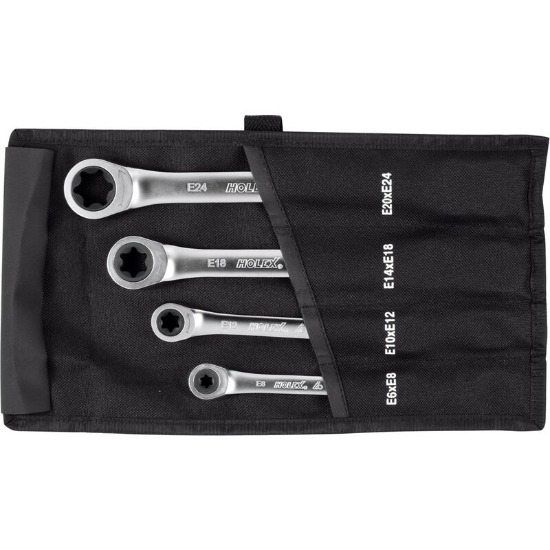 Forgiate. Con cricchetto ad anello particolarmente scorrevole. Anello di registro estremamente stretto: 5°. Materiale: Acciaio al cromo-vanadio, esecuzione cromata. Contenuto: cad. 1 chiave n. art. 619440: E6×E8, E10×E12, E14×E18, E20×E24 Fornitura: cad. 1 chiave n. art. 619440: E6×E8, E10×E12, E14×E18, E20×E24 Dati tecnici Superficie es. cromata Numero di denti 72 Materiale Acciaio al cromo-vanadio Angolo di registro Grad 5 Tipo di prodotto Chiave Numero chiavi 4