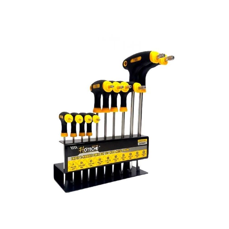 Set di 10 chiavi Torx con impugnatura a T. Art-262009 Set di 10 chiavi Torx con impugnatura a T. Art-262009 Scopri la praticità delle nostre 10 chiavi con impugnatura a forma di 'T'! Resistente con finitura satinata e punta brunita, offrono prestazioni affidabili. L'impugnatura morbida e antiscivolo garantisce una presa comoda, mentre il foro le rende facili da appendere. Le Misure sono: T9x100 mm T10x100 mm T15x100 mm T20x100 mm T25x150 mm T27x150 mm T30x150 mm T40x150 mm T45x200 mm T50x200 mm Il contenuto della confezione: N 10 chiavi dalle diverse misure N 1 Supporto da appendere
