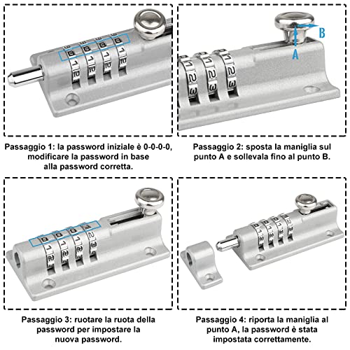 【Ampio Utilizzo】il catenaccio a combinazione è facile da installare e da collocare negli spazi più compatti. Può essere utilizzato all'interno come ante di armadi, bagni, cucine, ecc. E può essere utilizzato anche all'esterno in vani di camion, finestre di sicurezza, giardini, magazzini, ecc.