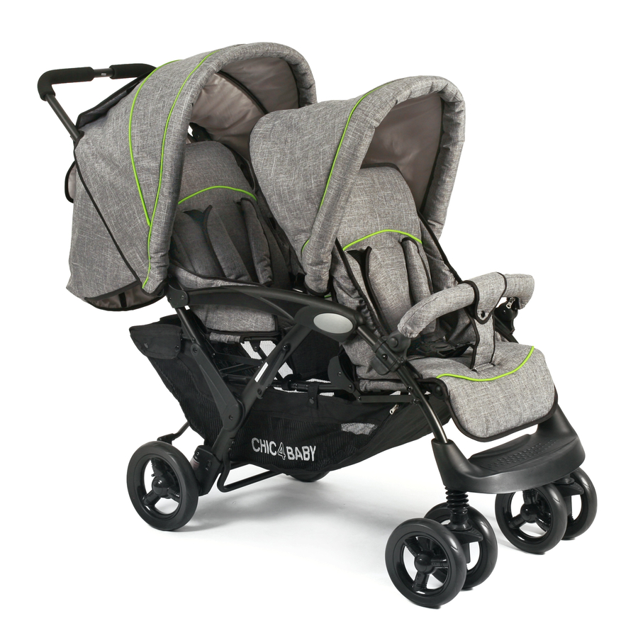 Il pratico passeggino CHIC 4 Baby DUO è dotato di ruote anteriori a doppio snodo bloccabili e di grandi ruote in plastica con freno di stazionamento posteriore. Il telaio è ammortizzato. Lo schienale del sedile posteriore è regolabile in 3 posizioni fino alla posizione nanna, lo schienale del sedile anteriore è regolabile in 2 posizioni fino alla posizione nanna. Le due cappottine sono pieghevoli e quella anteriore è rimovibile, sulla cappottina posteriore c'è una finestra panoramica copribile e una borsa per gli accessori. La carrozzina è dotata di cinture di sicurezza a 5 punti con spalline su entrambi i sedili e di un ampio cestino portabagagli con cerniere laterali per facilitare le operazioni di carico e scarico. Sono inclusi una spaziosa navicella morbida e un parapioggia. Dettagli del prodotto: Ruote anteriori a doppia gamba regolabili Grandi ruote posteriori in plastica con freno di stazionamento Schienale del sedile posteriore 3 volte regolabile fino alla posizione sdraiata Schienale del sedile anteriore 2 volte regolabile fino alla posizione sdraiata Cappottine pieghevoli e rimovibili Cintura di sicurezza a 5 punti Ampio cestino portabagagli Dettagli tecnici Dimensione da chiuso: 107 x 54 x 40 cm Dimensioni: 130 x 56 x 112 cm, altezza maniglione: 102 cm Superficie di riposo della navicella: ca. 70 x 30 cm Larghezza sedile: ca. 34 cm Peso: 18 kg Portata: 30 kg Incluso nella consegna: Ampia navicella morbida Copertura antipioggia
