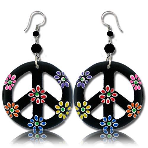 Gli orecchini in legno a forma di simbolo della pace hanno una dimensione di 51 mm e un gancetto in acciaio inossidabile. Al di sopra del simbolo Peace si trova una perla grande e una piccola in legno nero. Il marchio Peace è decorato con un totale di sei fiori, di cui uno in lilla, giallo, blu, rosso, arancione e rosa.