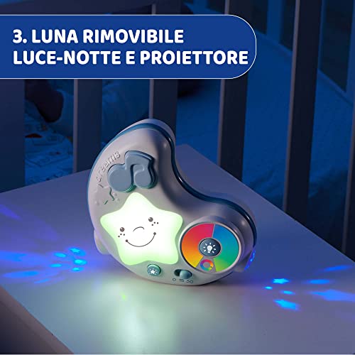 PROIETTORE LUCE NOTTE: Il modulo a forma di luna è removibile dalla palestrina e si può posizionare comodamente sul comodino per accompagnare il bambino nel momento della nanna anche con l'apposita funzione luce notte