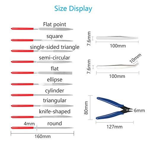 La confezione include:10 diversi tipi di lime ad ago,forbice da 1 pezzi e pinzette da 2 pezzi,le dimensioni ridotte di questi file sono eccezionali per lavori di finitura complessi.