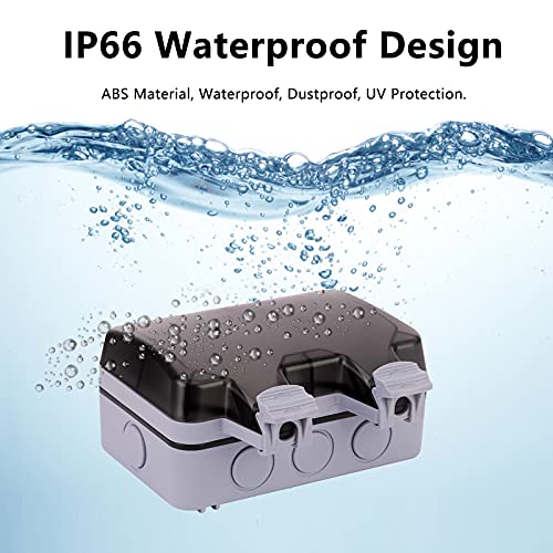 1. Scatola a doppia presa per esterni, con coperchio in ABS impermeabile IP66, ottime prestazioni antipolvere e impermeabili evitano l'incidente di cortocircuito, sicuro da usare. Può essere ben funzionale in qualsiasi situazione atmosferica, perfettamente utilizzato in ambienti esterni e interni.