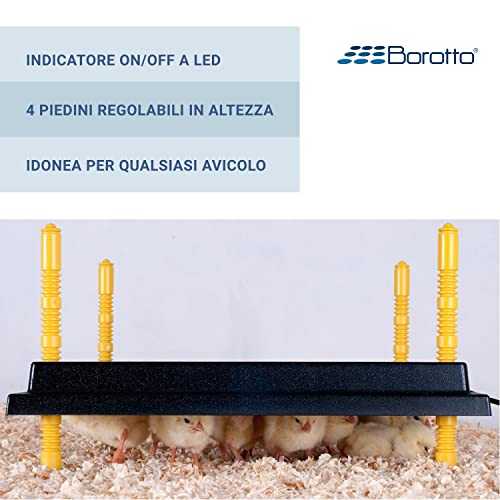 La Chioccia Artificiale è munita di 4 piedini regolabili in altezza man mano che i pulcini crescono ed ha la struttura principale in ABS, materiale estremamente resistente e facile da tener pulito.