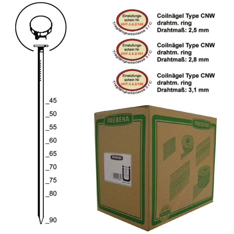 Chiodi a spirale Prebena tipo CNW28/70BKRI Lunghezza chiodo 70 mm Dimensione del filo Ø 2,8 mm Design Caricatore di fili - gambo ad anello Pezzi/scatola 6.000 Peso per scatola 20 kg Unità di imballaggio 1 x 6.000 -- I chiodi a bobina Prebena CNW da 32 a 90 mm - dimensione del filo: 2,2 - 3,1 mm - caricatore del filo - inclinazione 16° sono compatibili, tra l'altro, con i seguenti sistemi di chiodatura pneumatica: BeA - BDC Bostitch - Chiodi a bobina FAC Duofast - Chiodi a bobina CW Haubold - RNCW 25/55 - RNCW 31/90 Hitachi - Chiodi da coil CN 16 Holzher - Chiodi a bobina con connessione a filo Mafell - Chiodi da coil da 2,2x45 a 3,4x75 Max - Chiodi a bobina CN 16 Paslode - Chiodi a filo Powerfix - CN 16 Schneider - CN 29/65 - CN 31/90 Senco - Chiodi da coil ED/BJ/EL/BL/GD/HD//GL/HL/SC/SE/NS Würth - Chiodi a bobina I chiodi PREBENA a gambo liscio sono conformi alla norma DIN 1052 Parte 2 (resistenza alla trazione del filo del chiodo, diametro della testa, ecc.) I chiodi sono rivestiti