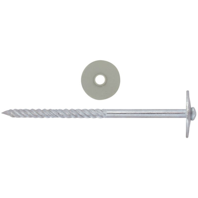 Zincato bianco, con filetto rullato e testa ad ombrello. Completo di rondella circolare in plastica.