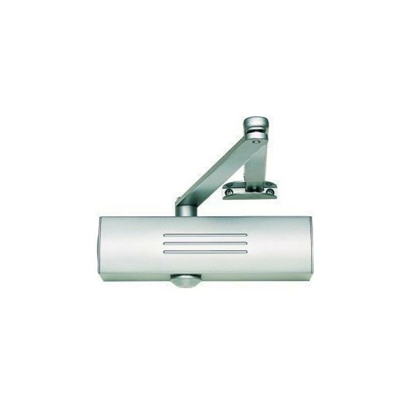 Chiudiporta idraulico con meccanismo a cremagliera. Per porte di larghezza massima 1250 mm e 100 kg. Forza regolabile in 2 in 5. Velocità di chiusura e corsa finale regolabili. Controllo del freno in apertura. Sistema di blocco dell'apertura.