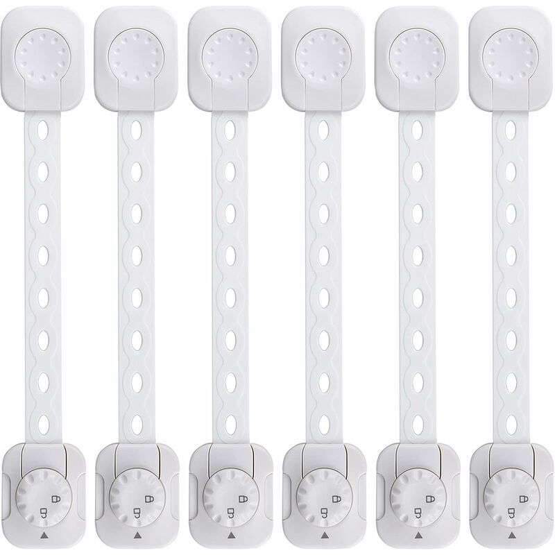 TENE FUORI I BAMBINI E GLI AMICI PELOSI: I lucchetti di sicurezza per bambini impediscono al tuo piccolo esploratore o adorabile animale domestico di entrare in aree pericolose o di rovinare la casa. È adatto per armadi, armadi, cassetti, sedili WC, finestre, forni e altro ancora. Doppio sistema di chiusura migliorato: il modello di serratura per armadio per bambini ha un doppio sistema di chiusura che protegge i bambini e gli animali domestici impedendo loro di apertura di ante o cassetti. Le serrature per armadietti sicure per bambini garantiscono un'infanzia sicura per il tuo bambino. Materiale durevole e non tossico: le nostre serrature di sicurezza per bambini sono realizzate in ABS e TPE atossici, che offrono maggiore flessibilità e durata, fornendo al tuo bambino con una casa sicura priva di sostanze chimiche. Cinghie regolabili per la personalizzazione: il fermo è progettato con fori per cinghie e pulsanti di bloccaggio regolabili intelligenti, che consentono di tagliare le