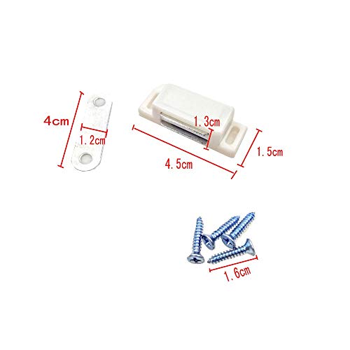 La confezione contiene: 25x chiusure magnetiche per mobili bianche di plastica + 100 viti. Forniscono offrono un modo semplice ed efficace per assorbire la porta facilmente e saldamente.