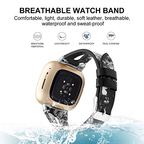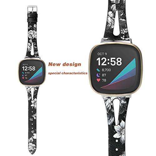 Chofit - Cinturino di ricambio compatibile con Fitbit Versa 3, sottile, in pelle, per donne e ragazze, per smartwatch Versa 3/Sense, colore: Nero con fiore bianco