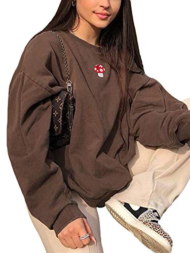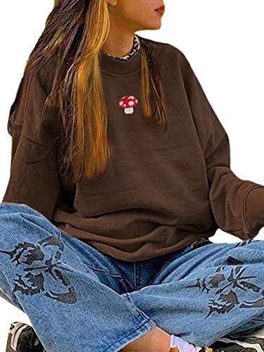 Chollius Felpa Donna a Maniche Lunghe con Ricamo a Fungo Hoodies a Base Casual Girocollo Allentato Sweatshirt Sportivo Pullover Top Adulti Oversize Boyfriend Autunno Primavera (Marrone, L)