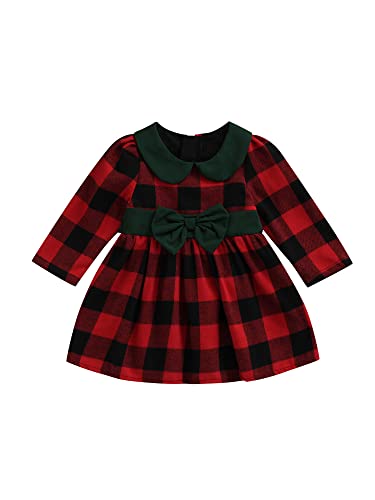 Chollius Vestito Natalizio Bambina 0-6 Anni Risvolto Abito Lungo Scozzese a Manica Lunga Ragazza Costume a Quadri Un Pezzo con Fiocco Dress Natale Principessa Autunnale Elegante (Rosso, 2-3 Anni)