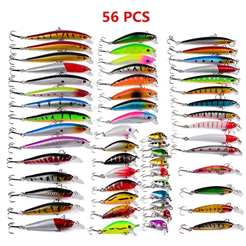 Grande valore e Professionisti: 56 pezzi esche da pesca e accessori. Comprende diversi tipi di esche. Varie dimensioni e design per catturare diversi pesci, come trota, spigola, salmone, ecc. Le esche da pesca è adatto per acqua dolce e salata e tutti gli strati nuoto. Set meraviglioso per il vostro on-the-go battute di pesca.