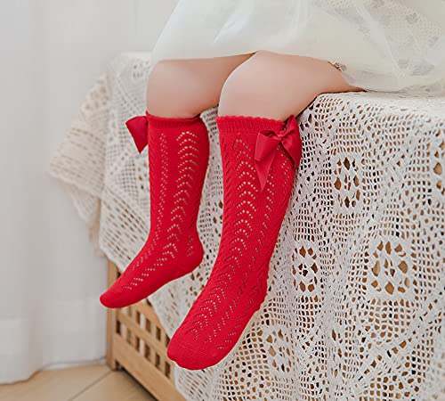 CHUNG Calze alte al ginocchio in cotone lavorato a maglia con fiocco per neonate, Cavo-Rosso/Crema/Pesca Rosa, 3-12 mesi