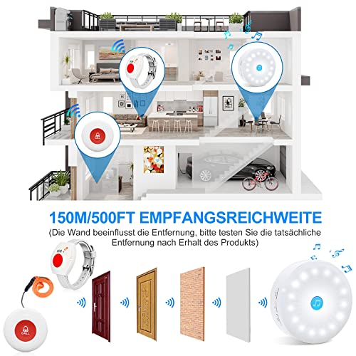 Ampia portata: gli anziani possono richiedere emergenza. La portata in aree aperte è di circa 150 piedi/45 m. Portata di ricezione del pulsante del cordino 500Ft/150M. Volume del ricevitore regolabile a 5 livelli da 0 dB a 110 dB. Il pulsante di emergenza per anziani si sente in tutta la casa