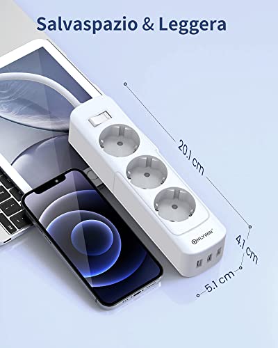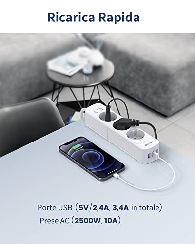 【6-in-1 Multipresa con USB】La multipresa con usb è progettata per supportare 110V-250V. 3 prese da 10A e 3 porte USB forniscono alimentazione a tutti i dispositivi, è possibile ricaricare più dispositivi contemporaneamente per risparmiare tempo.