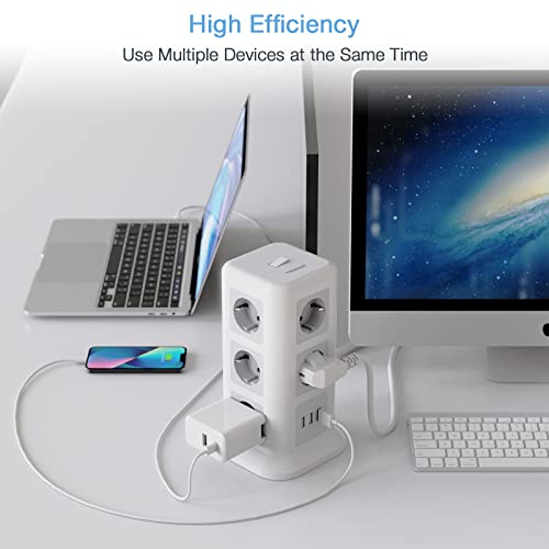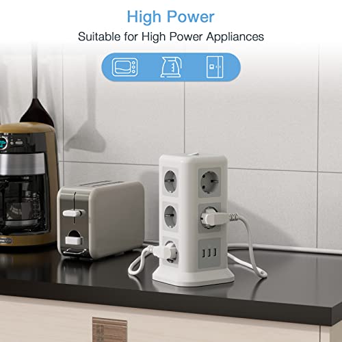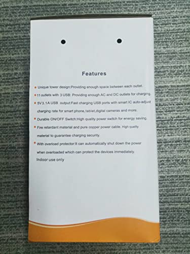 11 prese e 3 porte di ricarica USB: le 11 prese si trovano sui quattro lati della multipresa verticale USB. Il ciabatta elettrica USB offre spazio sufficiente per ogni presa adatta per spine più grandi. 3 porte USB con circuiti integrati intelligenti integrati supportano una corrente totale di 3,1 A. Può rilevare automaticamente i tuoi dispositivi e fornire la corrente più veloce fino a 2,4 A.