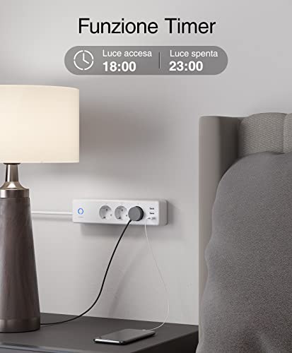 Timer e Monitoraggio Energia -- Puoi creare il tuo programma per ogni dispositivo connesso alla ciabatta wifi e attivare/disattivare automaticamente il dispositivo (come luci, caffettiera, frigorifero, ventilatore, lavatrice, condizionatori, TV) in momenti diversi. Inoltre, Monitora in tempo reale l'energia consumata dal dispositivo connesso giornalmente o mensilmente. La funzione può risparmiare energia e prolungare la vita del prodotto.